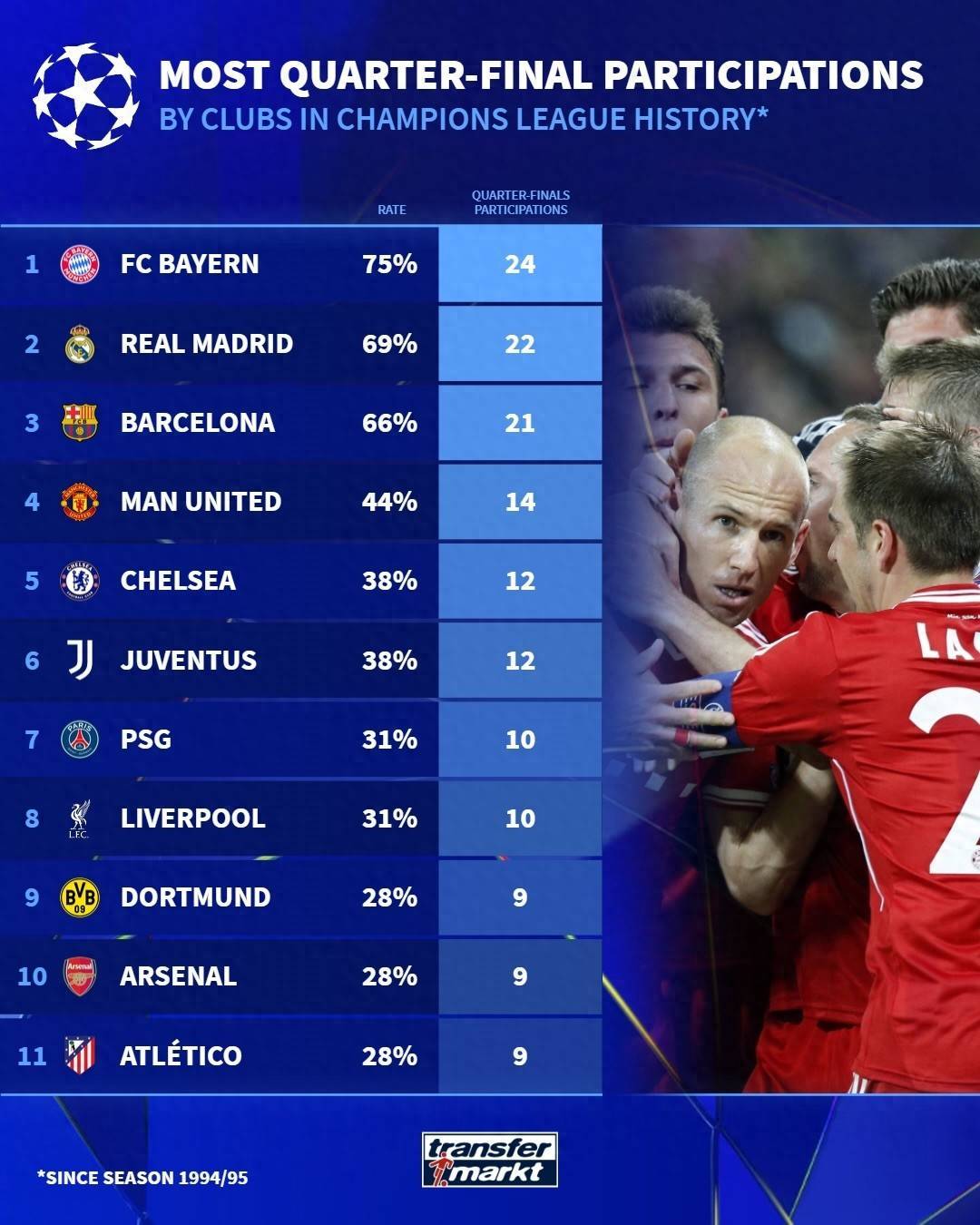 第一:拜仁/德甲,24次。 第二:皇马/西甲,22次。 第三:巴萨/西甲,21次。 第四:曼联/英超,14次。 第五:切尔西/英超,12次。 并列第五:尤文图斯/意甲,12次。 第七:巴黎/法甲,10次。 并列第七:利物浦/英超,10次。 第九:多特蒙德/德甲,9次。 并列第九:阿森纳/英超,9次。 并列第九:马竞/西甲,9次。